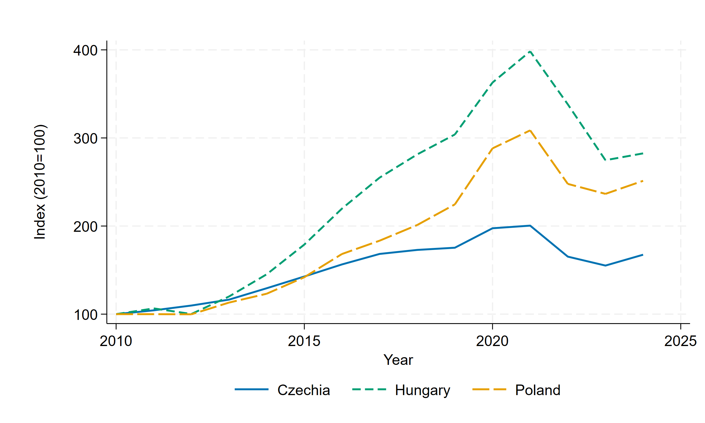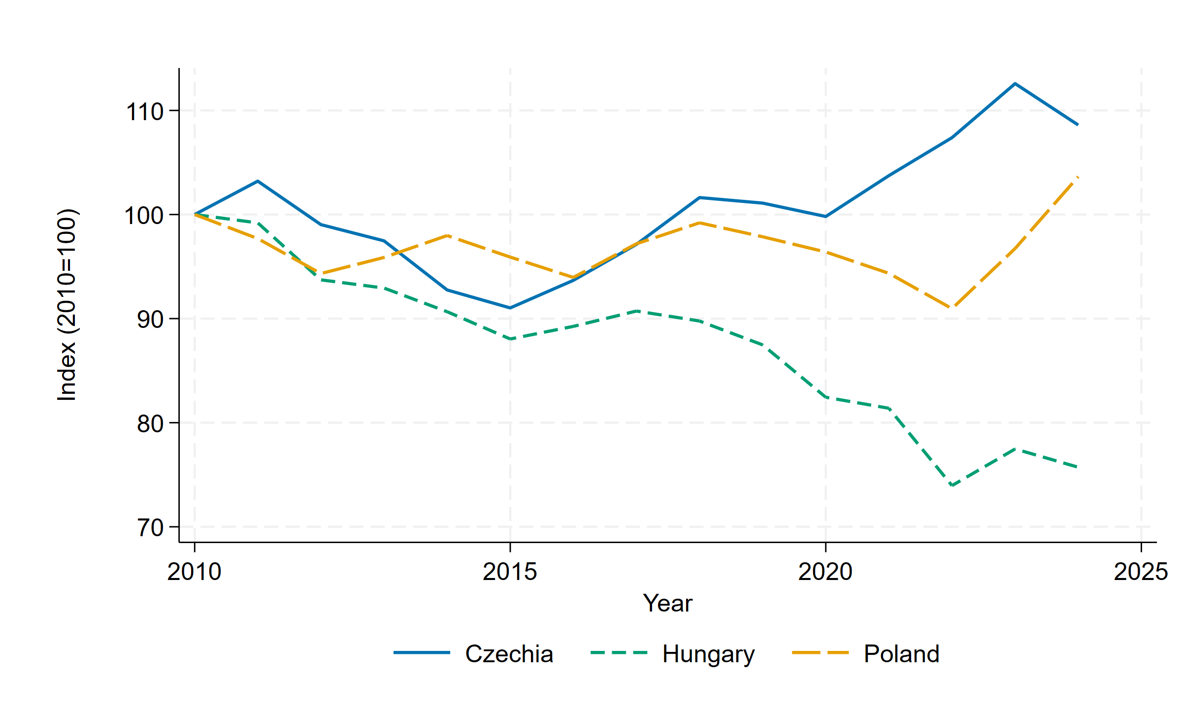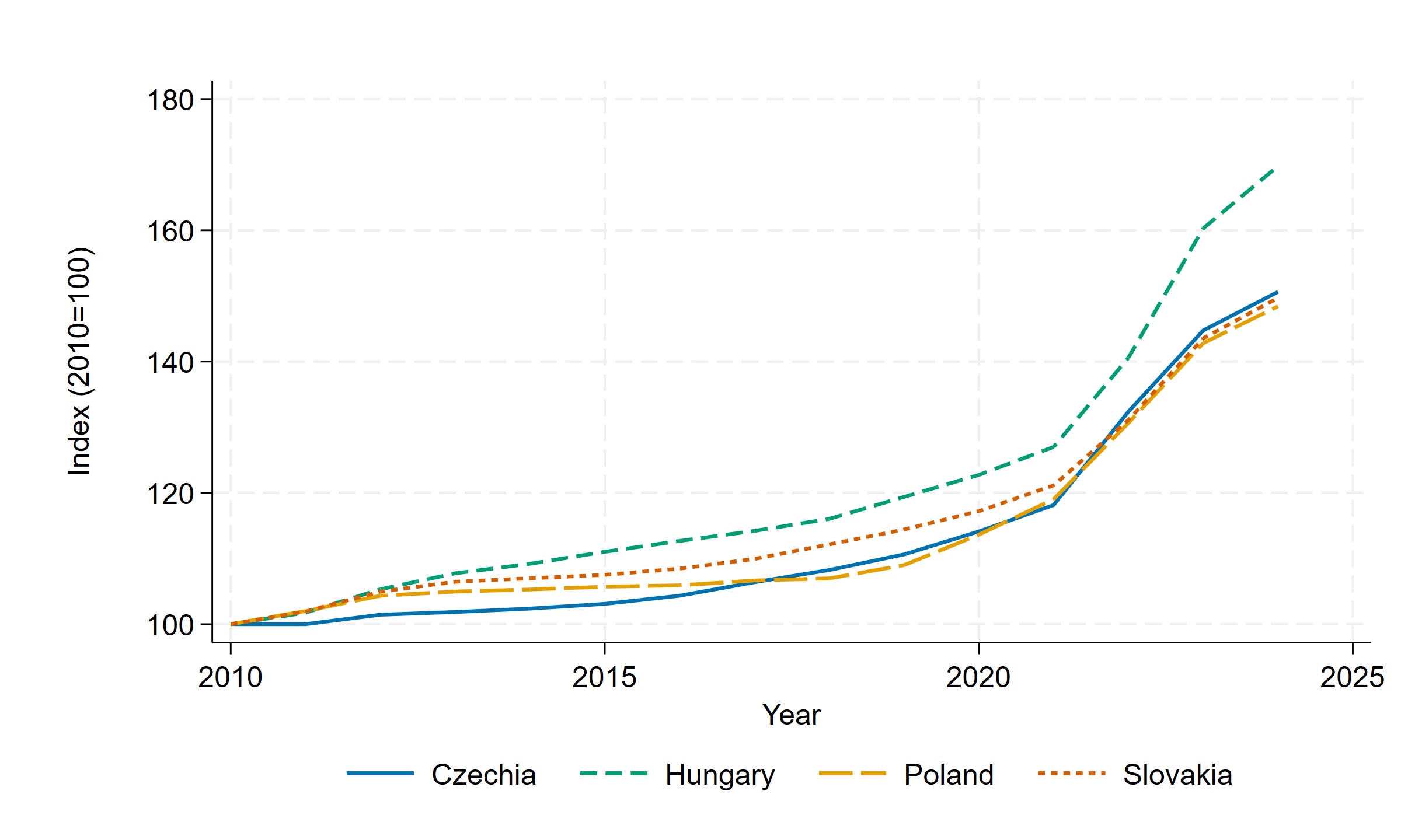 A monetáris kondíciók közötti fenti eltérés az árfolyampályákban is megjelent. A 3. ábra a nominális effektív árfolyamot (NEER) mutatja, amely több partner devizájához viszonyított index. 2010 és 2024 között a zloty nagyjából a 2010-es szint körül maradt, a korona pedig enyhén erősödött, miközben a forint effektív árfolyama érdemben, megközelítőleg 25%-kal mérséklődött.