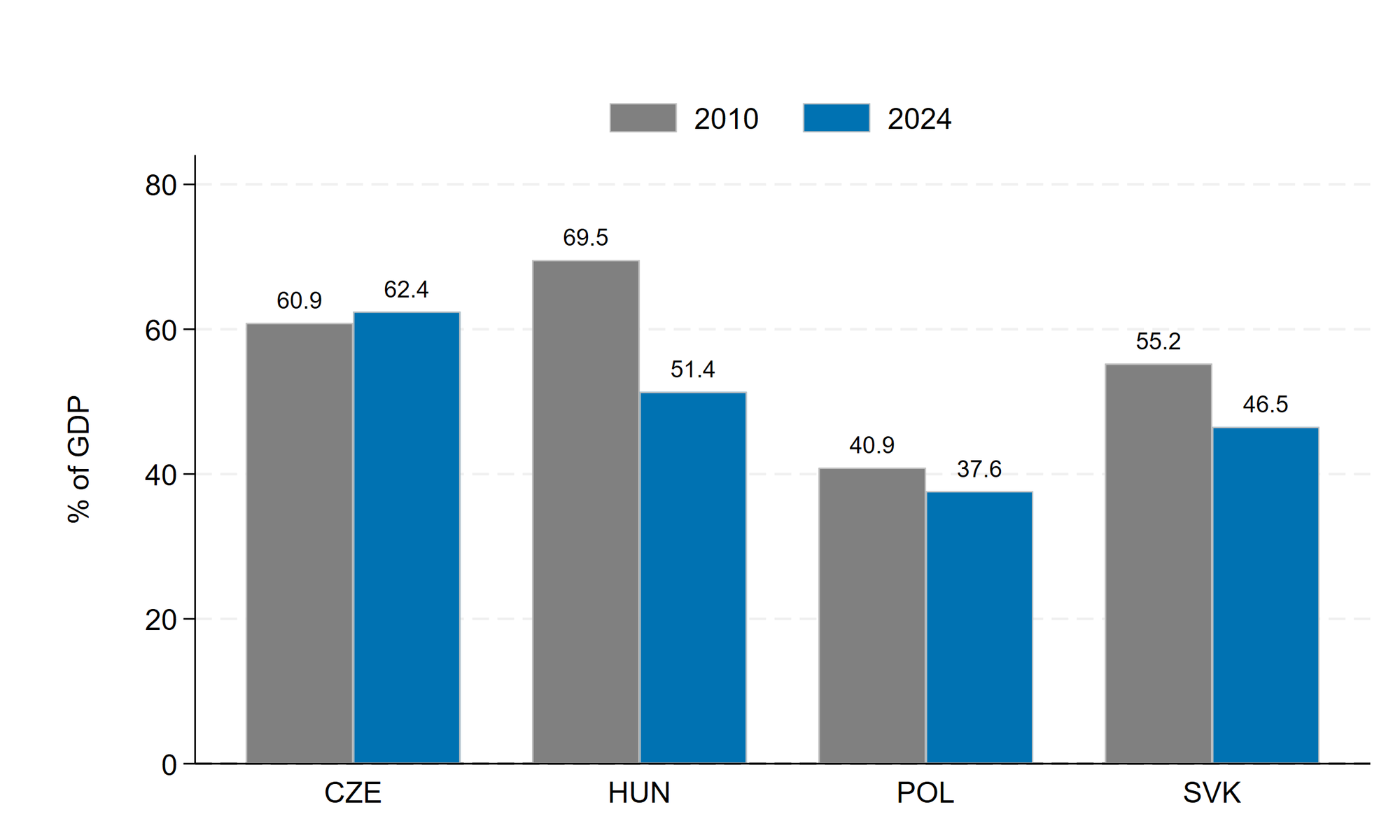 Gyakori érvelés, hogy a leértékelődő deviza a relatív költségek mérséklésén keresztül vonzóbbá teszi az országot a működőtőke-befektetők (FDI) számára. A tanulmány adatai alapján azonban ez az összefüggés nem automatikus. A 4. ábra szerint a gazdaság FDI-intenzitása (az állomány a GDP arányában) Magyarországon érdemben mérséklődött (kb. 70% → 51,4%), miközben Csehországban stabil maradt, sőt enyhén nőtt (61% → 62,4%) – annak ellenére, hogy a cseh deviza ebben az időszakban számottevően erősebb pályán mozgott.