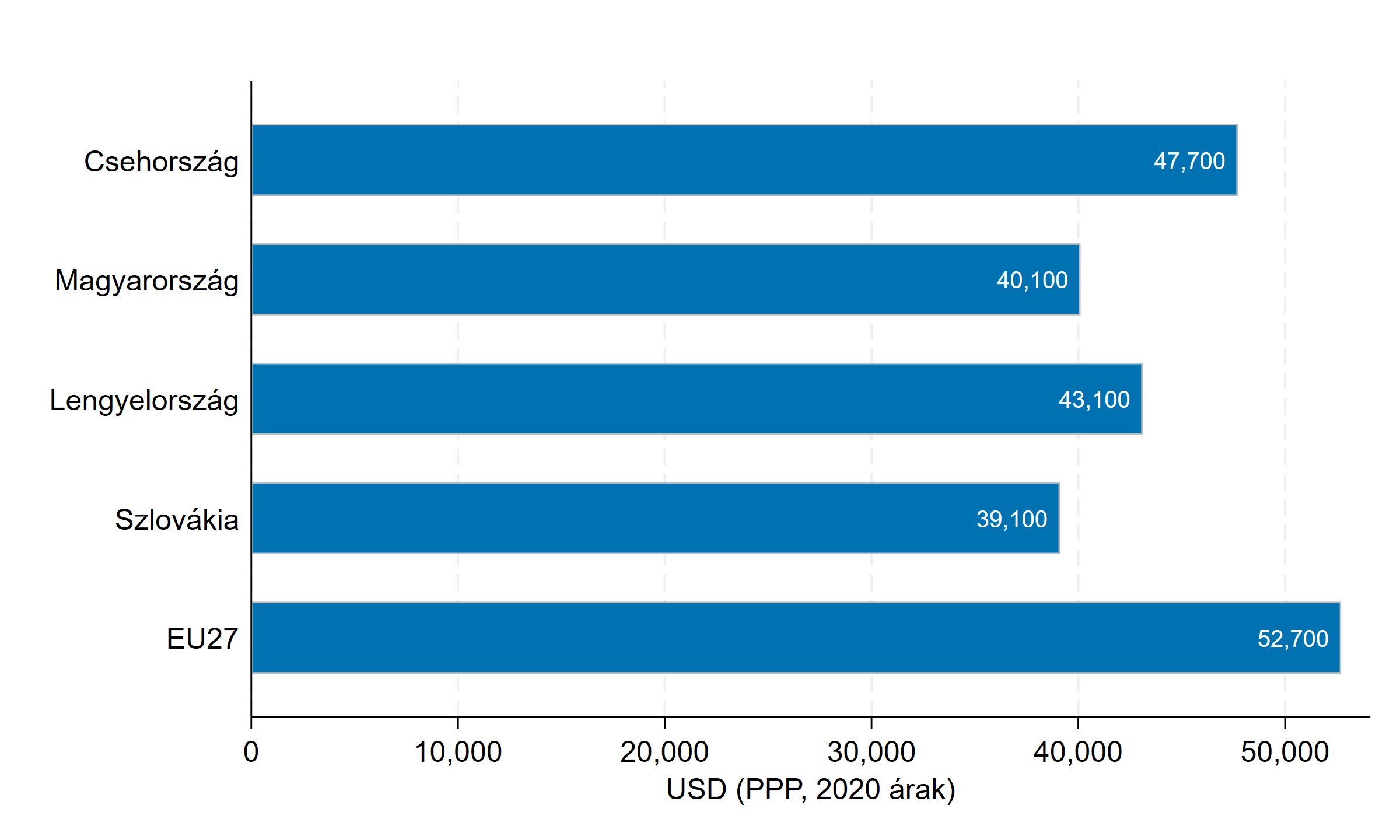 Ahogy az 1. ábra is mutatja, 2024-ben az EU-27 egy főre jutó reál GDP-je vásárlóerő-paritáson (PPP) kb. 52,7 ezer USD volt (2020-as árakon). A V4-en belül Csehország állt a legközelebb (47,7 ezer), majd Lengyelország (43,1 ezer), Magyarország (40,1 ezer) és Szlovákia (39,1 ezer) következett.