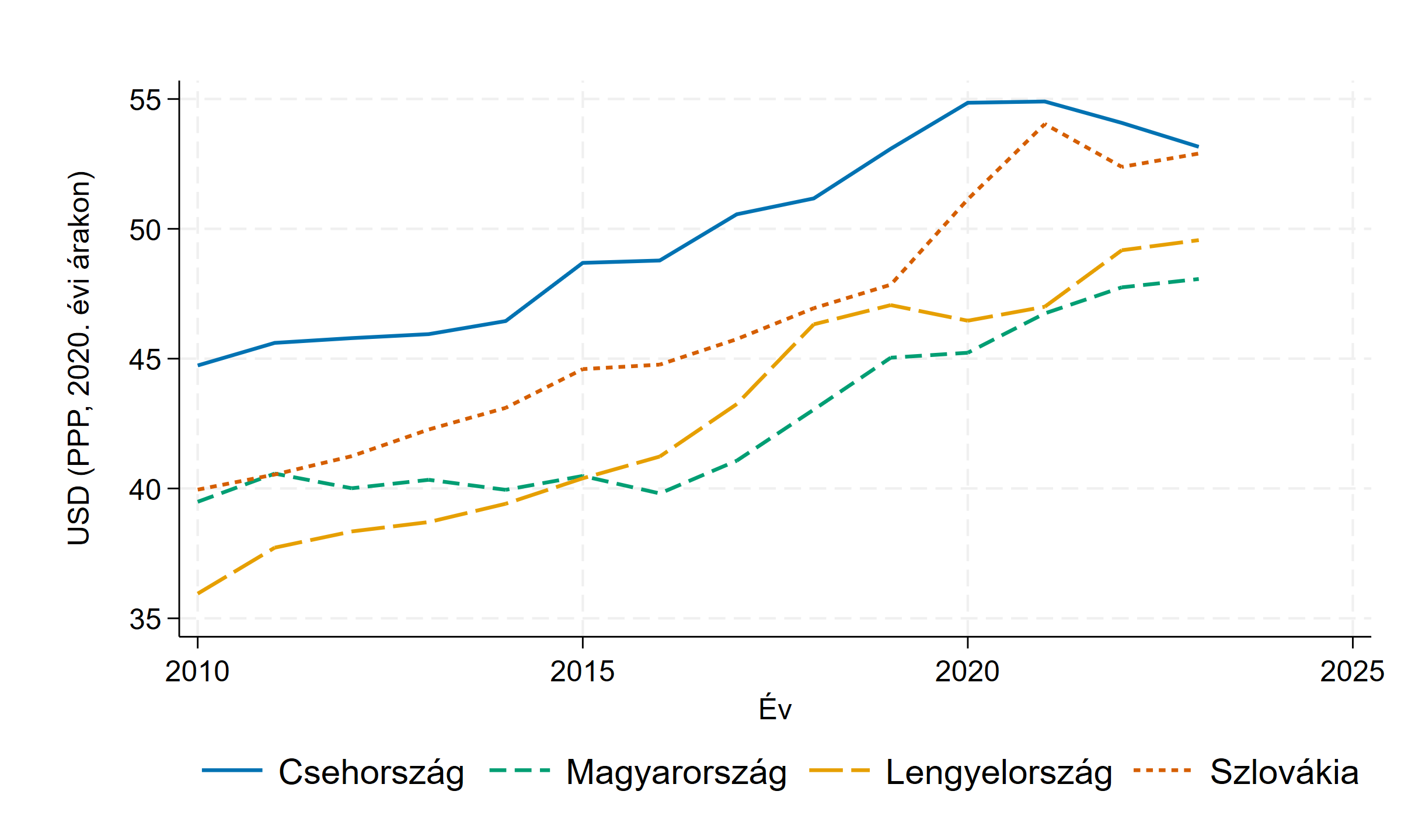 A felzárkózás „minőségi” különbségét az is jól szemlélteti, hogy mennyi értéket termel egyetlen ledolgozott munkaóra. A 4. ábra alapján 2024-re Csehország, Szlovákia és Lengyelország munkatermelékenysége szorosan együtt, az 52–54 USD/óra (PPP) sávban mozog. Magyarország ettől némileg lemaradva, 48 dollár körüli szinten áll. Ez összhangban van azzal, hogy a foglalkoztatás puszta bővülése önmagában nem feltétlenül jár együtt a termelékenység hasonló ütemű felzárkózásával.