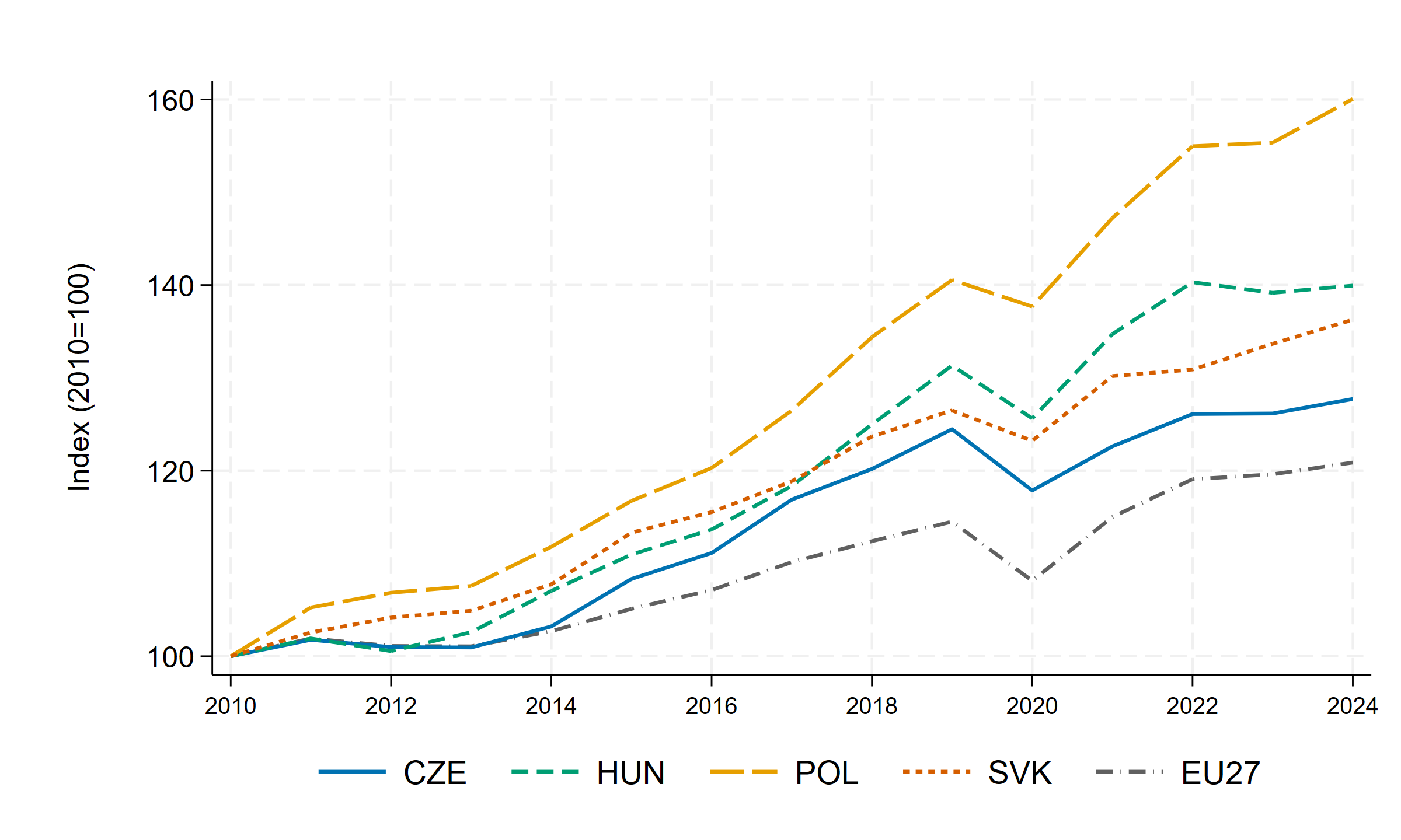 A kép alapján Lengyelország a leggyorsabb: kb. +60%-os kumulált növekedést ért el. Magyarország a második: kb. +40%. Szlovákia kb. +36%, Csehország pedig kb. +28% körül van. Összehasonlításként az EU-27 ugyanebben az időszakban kb. +20%-ot nőtt. Fontos hozzátenni, hogy Csehország 2010-ben már jóval közelebb volt az EU-átlaghoz, míg Lengyelország alacsonyabbról indult — ezért a „felzárkózási tér” is más volt.