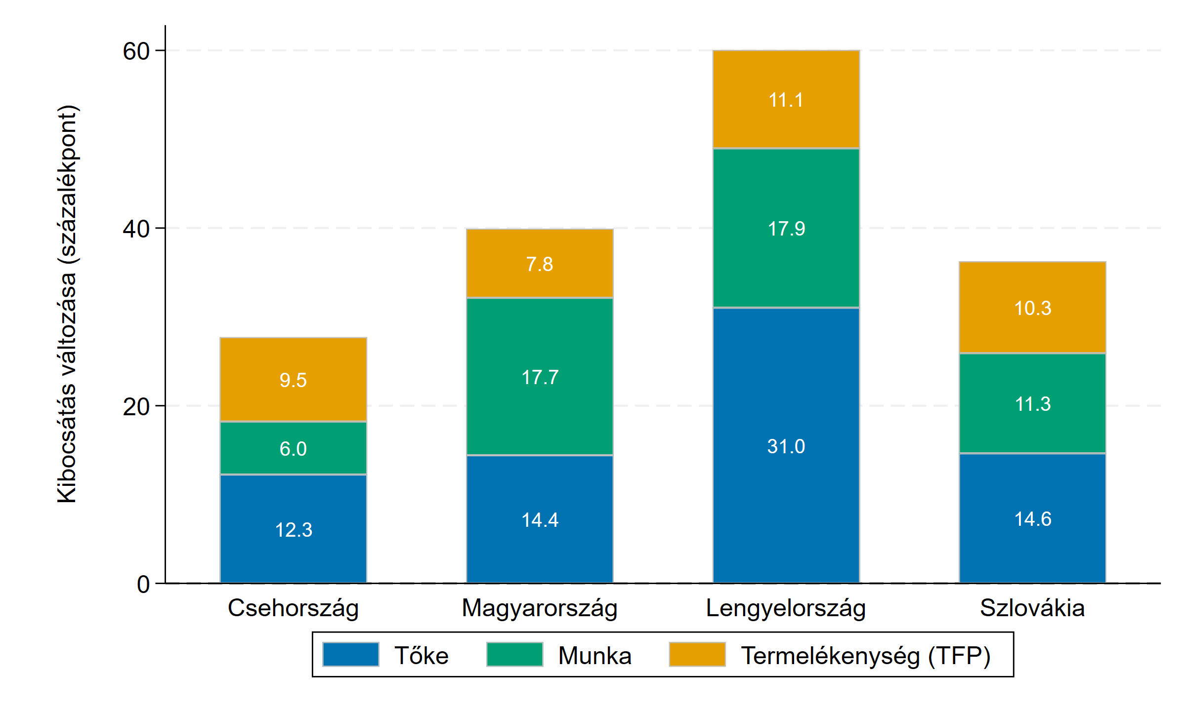 📌 Lengyelország: a közel 60%-os növekedés nagy része beruházásokból és termelékenység-javulásból állt össze (tőke: ~31 százalékpont, TFP: ~11 százalékpont, munka: ~18 százalékpont).