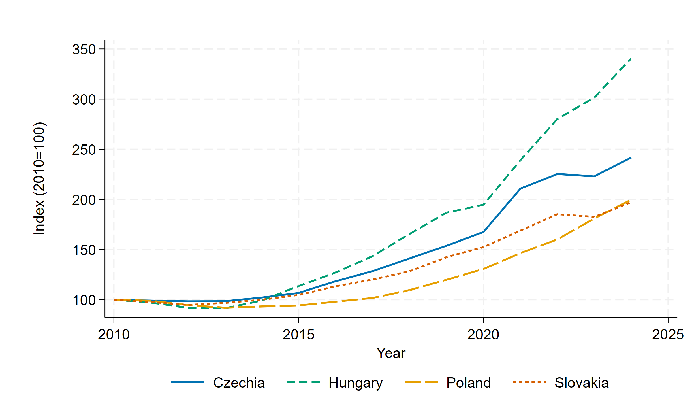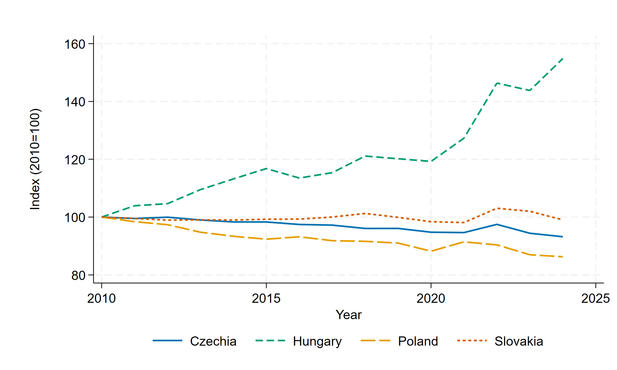 Az 1. ábra ezt mutatja: a beruházások relatív árát (beruházási deflátor / GDP-deflátor). A V4-ben a relatív beruházási árak alakulása eltér: míg Csehországban, Lengyelországban és Szlovákiában ez a mutató 2010 és 2024 között átlagosan mintegy 5%-kal mérséklődött, addig Magyarországon ugyanezen idő alatt több mint 50%-kal emelkedett.